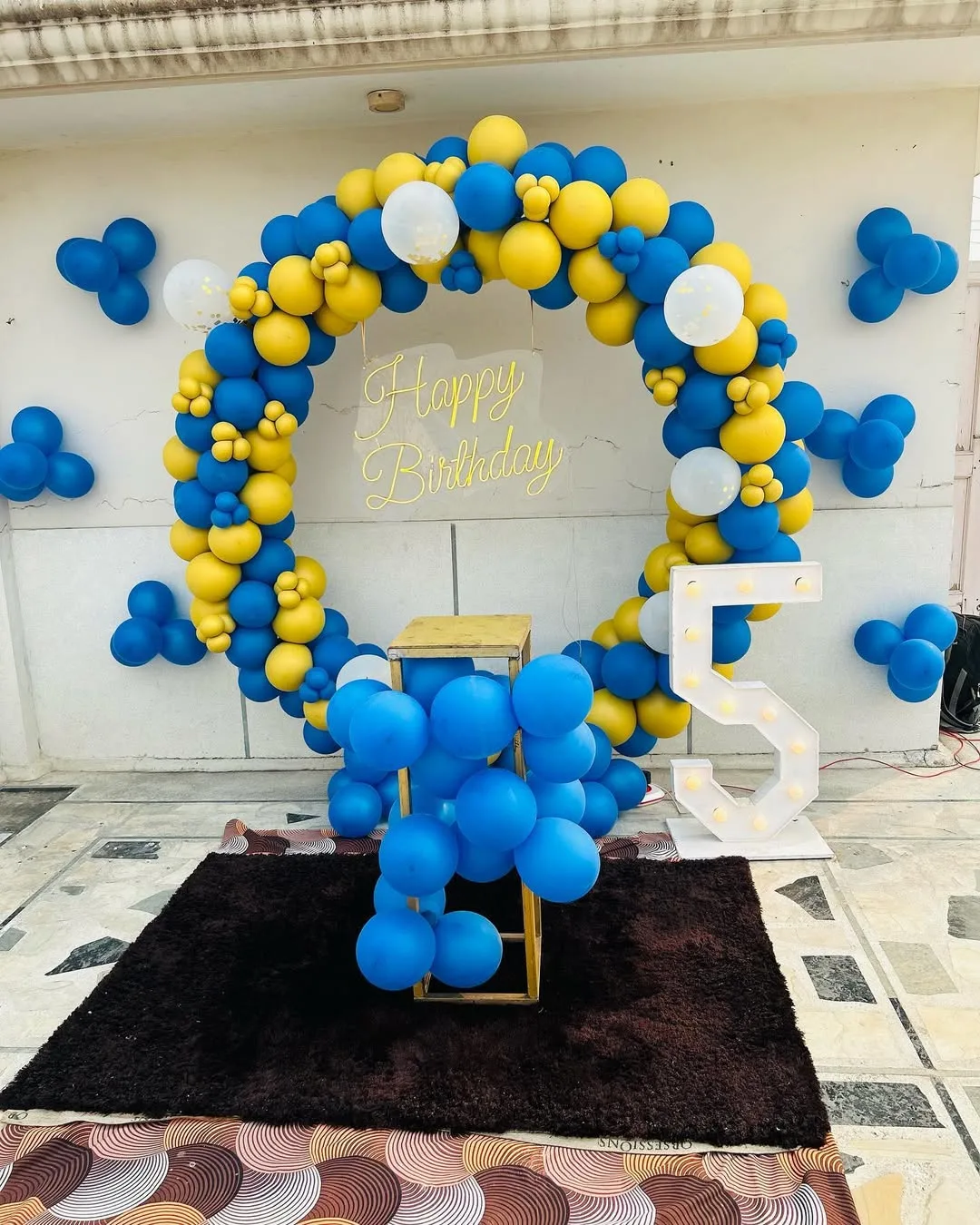 *️⃣This vibrant circular balloon backdrop is a perfect choice for birthdays, featuring a striking combination of royal blue and bright yellow balloons. The Happy Birthday neon sign adds a glowing *️⃣touch, making it an eye-catching display. A marquee number ("5" in this case) personalizes the cel...