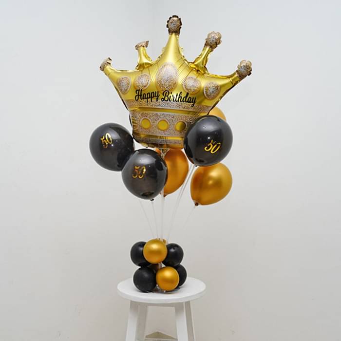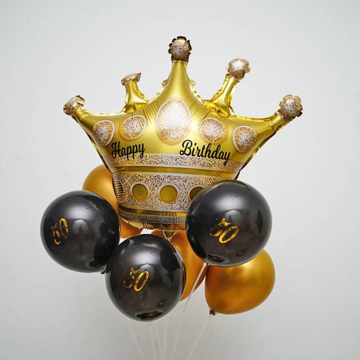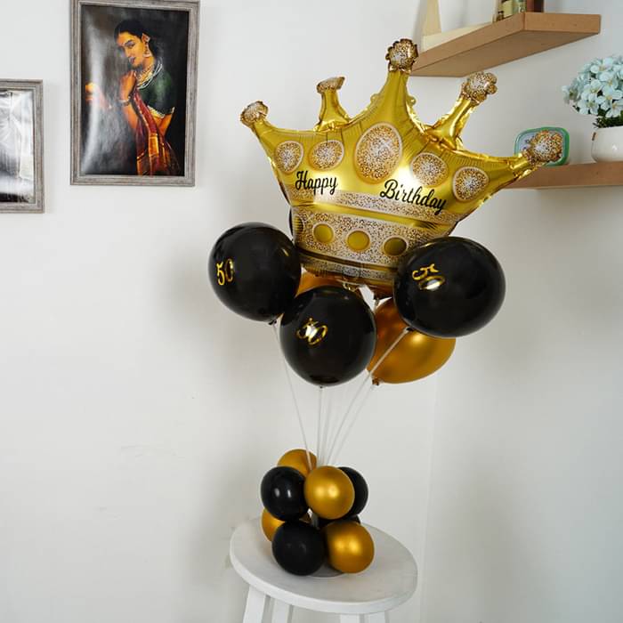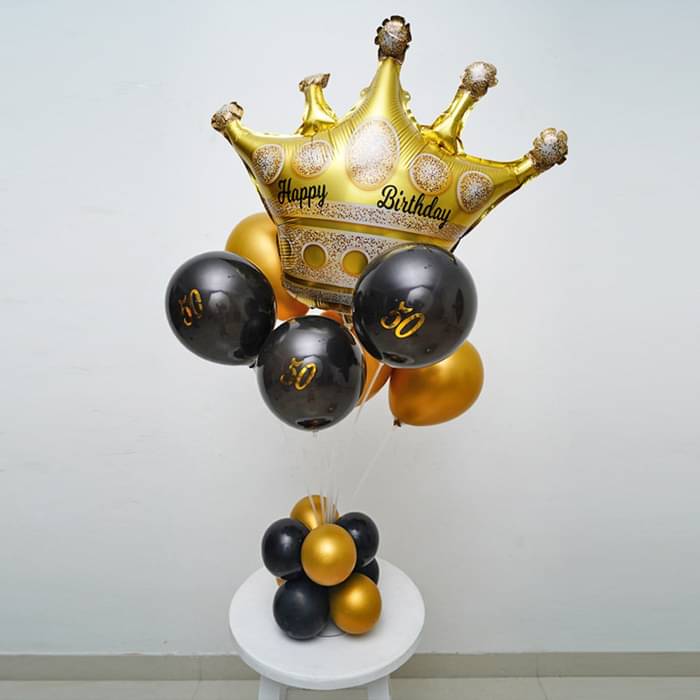A luxurious and regal birthday balloon arrangement featuring a golden crown foil balloon as the centerpiece. The black and gold color scheme adds a sophisticated touch, making it perfect for milestone birthdays, grand celebrations, and VIP parties.