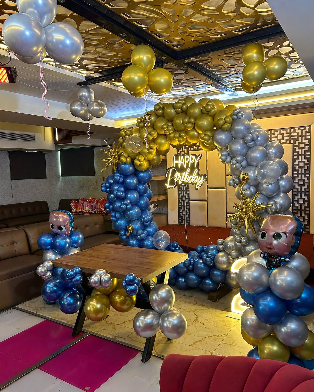This luxurious birthday decoration features an extravagant gold, blue, and silver balloon arch with a 'HAPPY BIRTHDAY' neon sign, perfect for lavish parties and milestone birthdays. The venue is enhanced with hanging ceiling balloons, character-themed balloon sculptures, and glowing décor element...