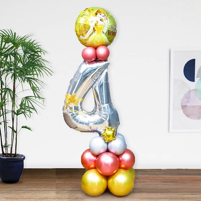 This magical and elegant balloon arrangement is perfect for a princess-themed birthday celebration. Featuring a large silver number "4" foil balloon (customizable to any number) and a princess-themed birthday foil balloon, this design creates an enchanting ambiance. Accented with gold, pink, and ...