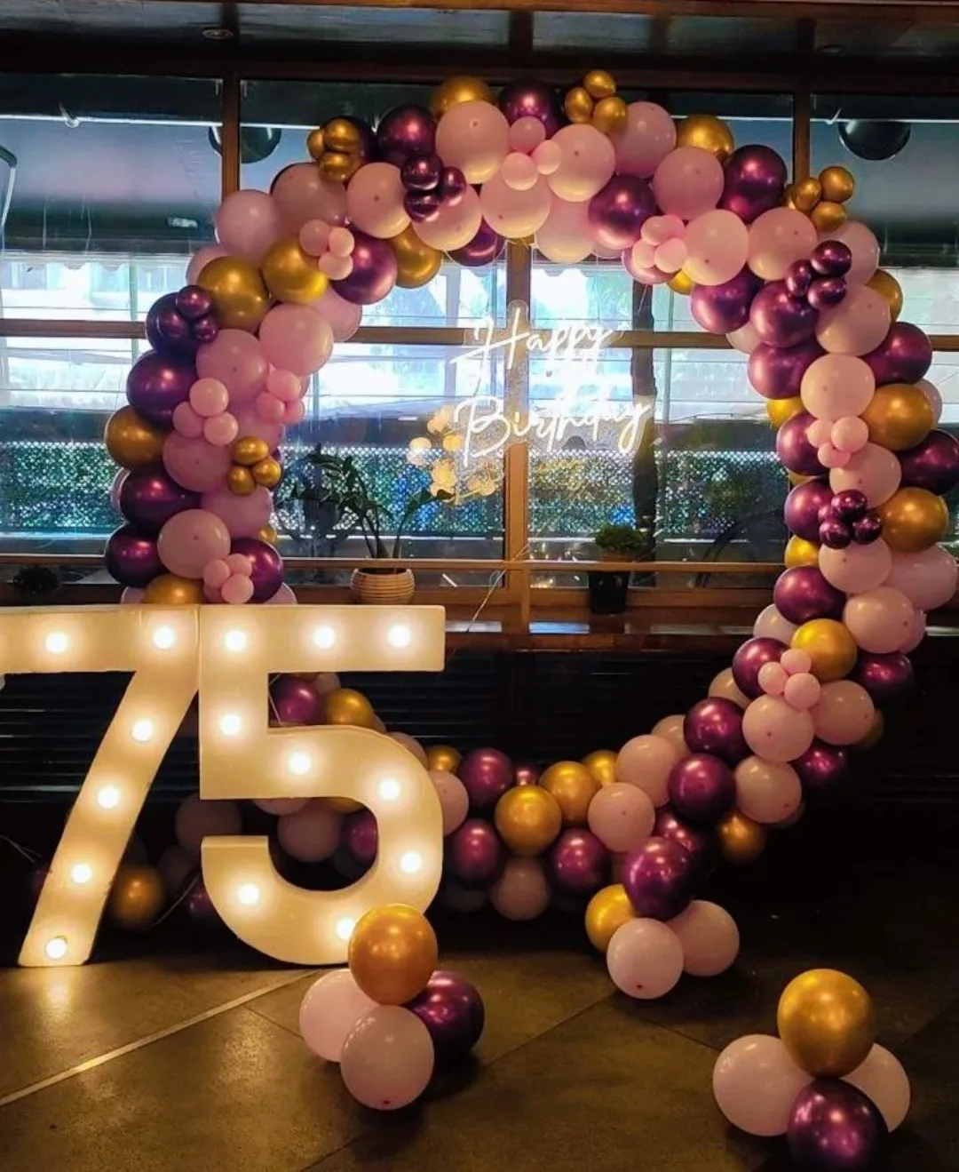 ✯ ✯ This elegant and grand birthday setup features a stunning circular balloon arch in royal purple, pastel pink, and metallic gold—a perfect luxurious color combination for a 75th birthday celebration. A