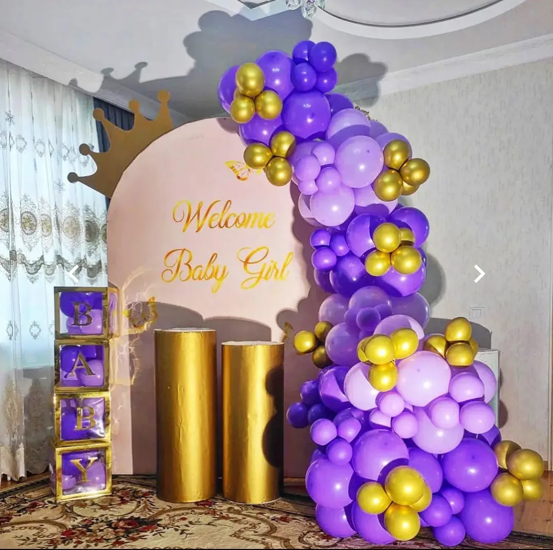 This elegant and luxurious baby shower backdrop features a stunning purple and gold balloon arch, symbolizing royalty and celebration for a baby girl’s welcome event. The backdrop has a soft blush pink panel with “Welcome Baby Girl” in elegant golden script, making it perfect for memorable photos...