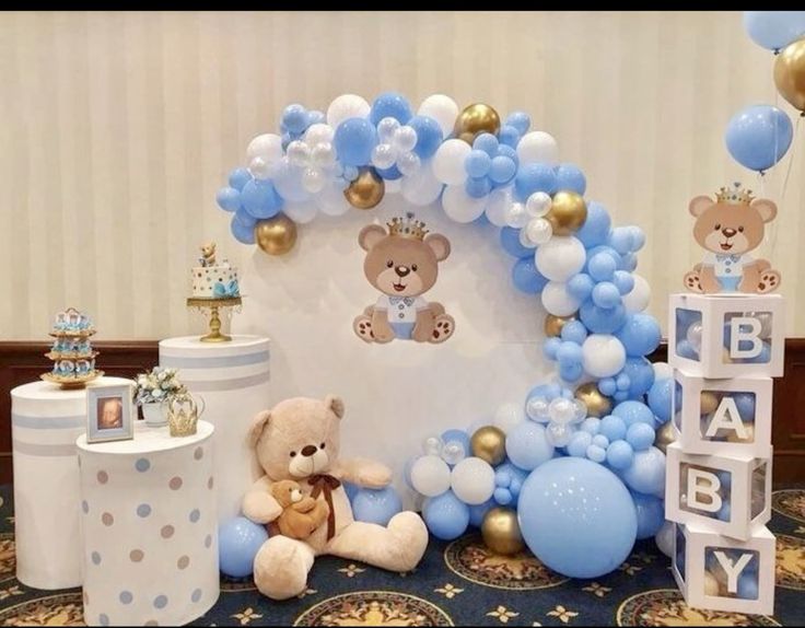 This adorable and elegant baby shower décor is designed around a royal teddy bear theme, featuring a beautiful balloon arch in shades of blue, white, and gold. The arrangement includes a round backdrop with a teddy bear illustration, stacked BABY blocks with a teddy bear cutout, and decorative de...