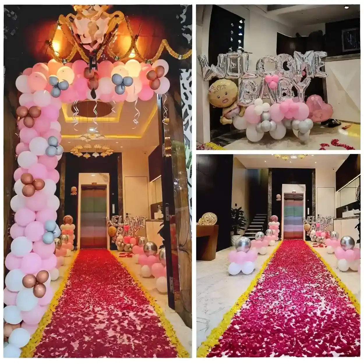 Make a grand entrance for your little one with this luxurious baby welcome decor. Featuring a stunning balloon arch at the doorway, a full red rose petal pathway, and a charming balloon cluster backdrop with “WELCOME BABY” foil letters, this setup is perfect for home celebrations that call for a ...