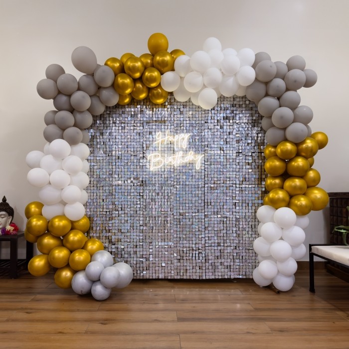 Add a touch of luxury to your celebration with this stunning Silver Sequin Wall Birthday Decoration with Gold Balloon Garland. This premium setup features a dazzling silver shimmer sequin backdrop beautifully framed with elegant white, champagne, and metallic gold balloons, creating a sophisticat...