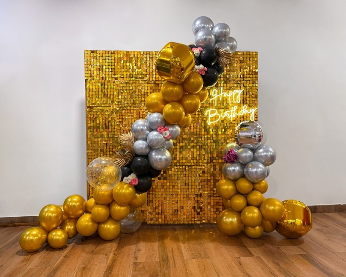 Celebrate in style with this stunning Luxury Gold Shimmer Wall Birthday Decoration Setup. This premium décor features a dazzling gold shimmer sequin backdrop paired with elegant gold, silver, black, and chrome balloon arrangements, creating a glamorous and sophisticated party atmosphere.
