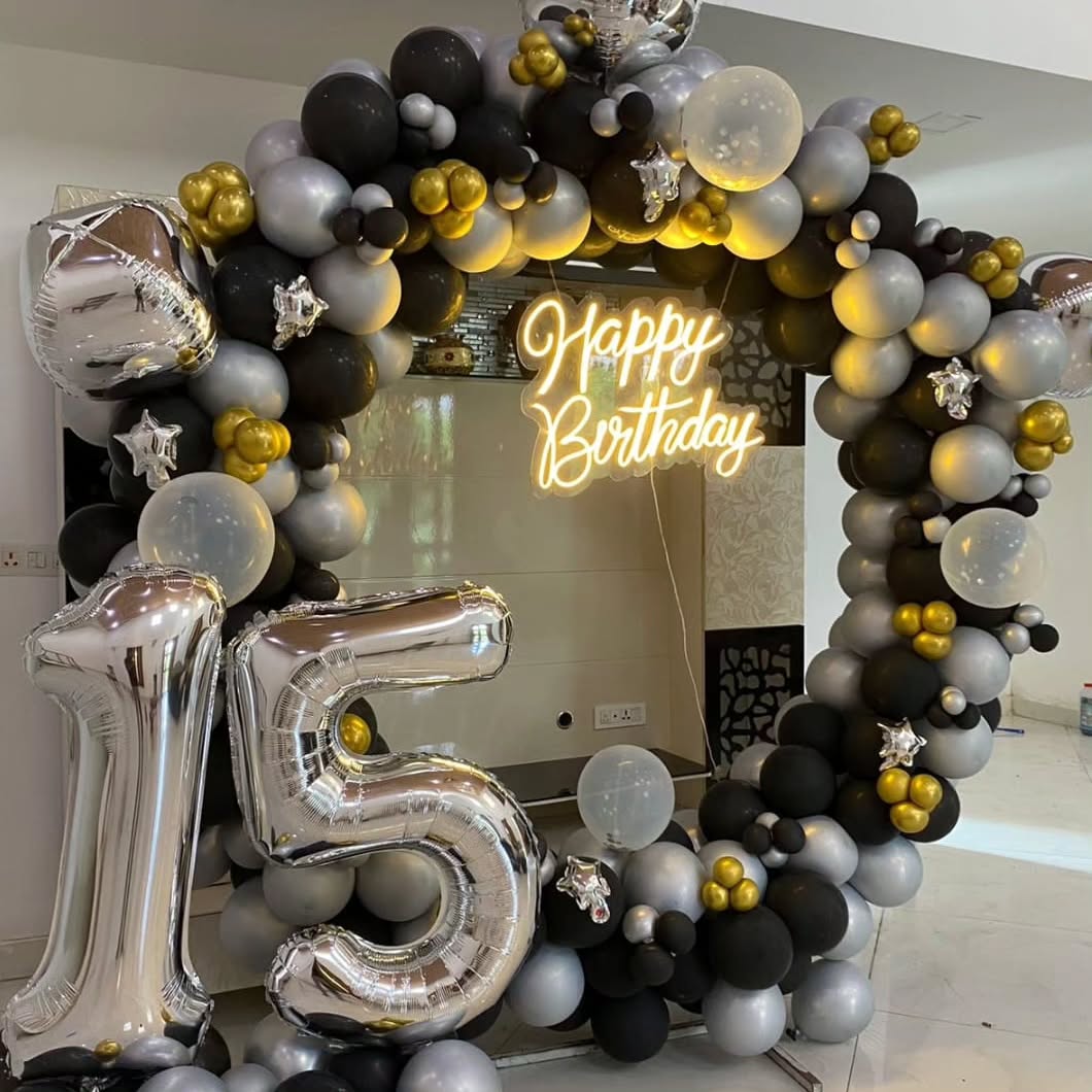 This elegant and modern balloon arch setup features a sophisticated black, silver, and gold theme. The arch is made up of varying balloon sizes, including transparent balloons with gold confetti inside for an extra luxe touch. A glowing "Happy Birthday" neon sign is placed at the center, en...