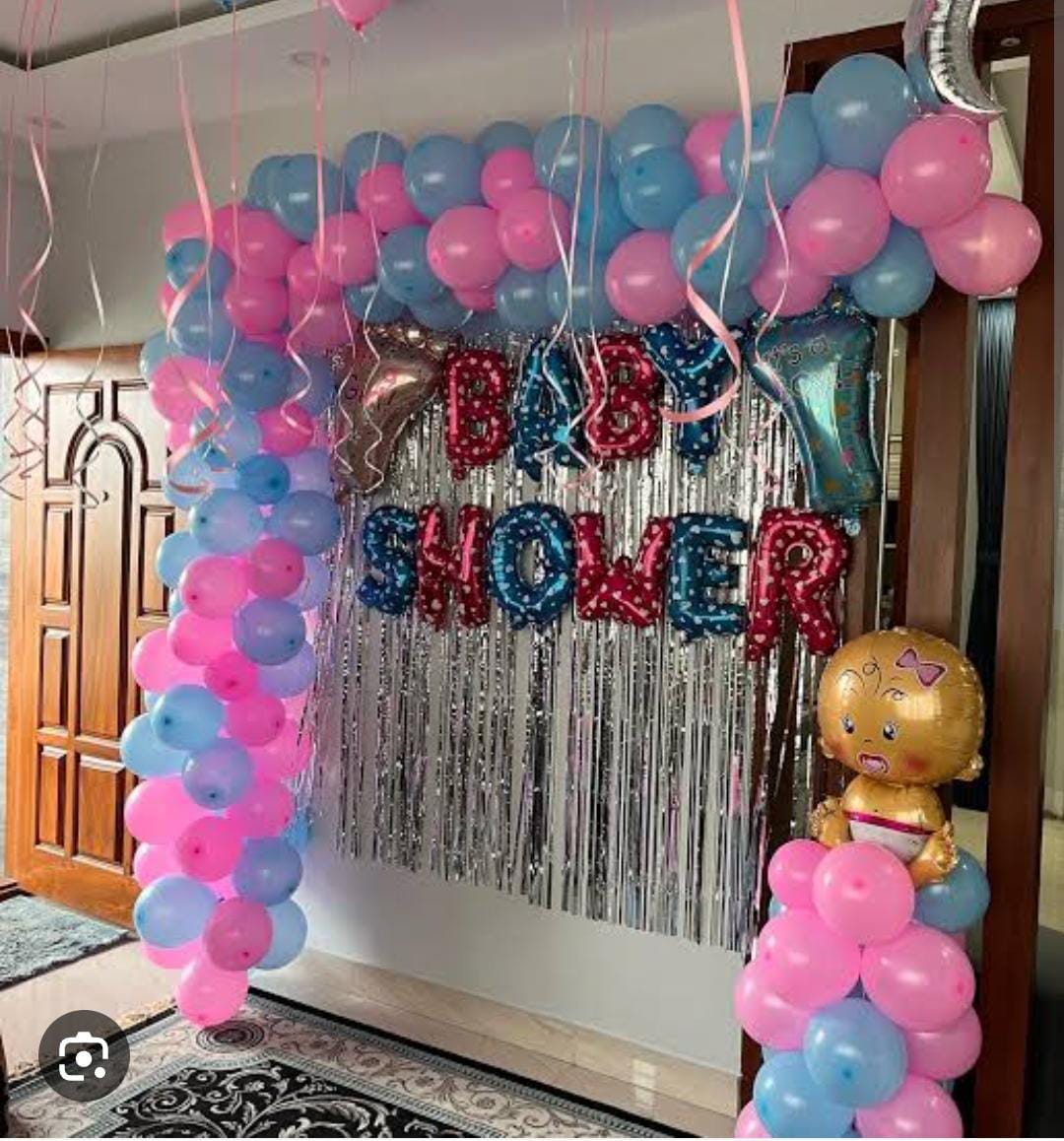 This stunning baby shower decoration features a blue and pink balloon arch, symbolizing excitement for a baby boy or girl. The elegant silver fringe curtain backdrop adds a glamorous touch, making it perfect for photoshoots and celebrations. The decor includes BABY SHOWER foil balloons in blue an...