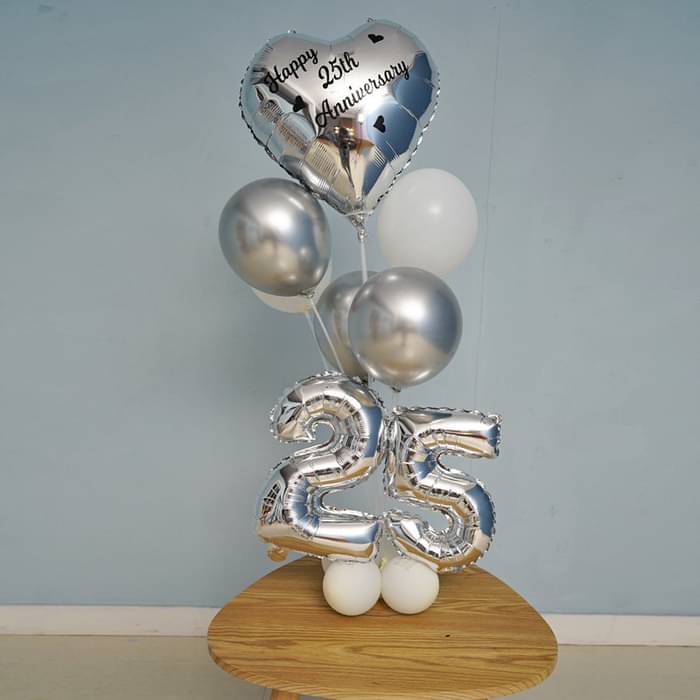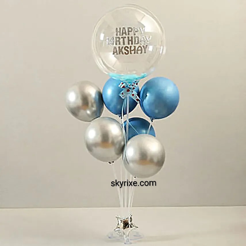 A classy personalised balloon arrangement featuring a transparent bubble balloon customised with the celebrant’s name and message, paired with metallic silver chrome and royal blue balloons. Finished with elegant ribbons and a star weight base, this bunch is perfect for birthdays, desk surprises,...