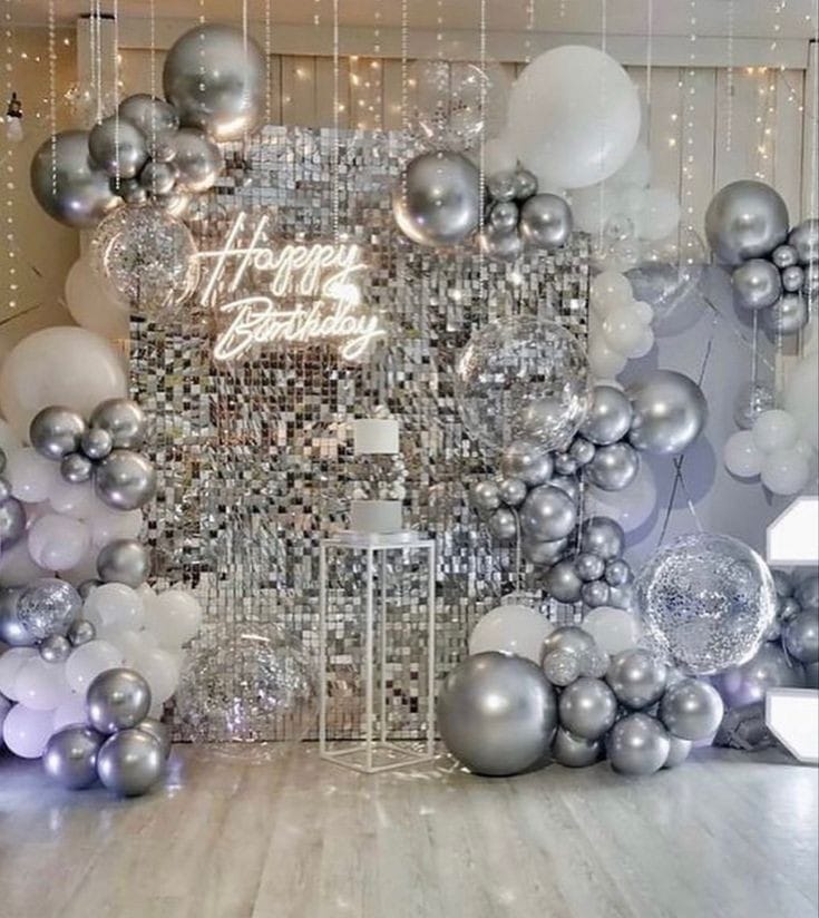 Elevate your celebration with this premium silver luxe theme. The backdrop features shimmering sequins, a stylish mix of metallic silver, chrome, and white balloons in varied sizes, paired with a chic “Happy Birthday” neon sign. This setup is ideal for milestone birthdays, anniversaries, or any e...