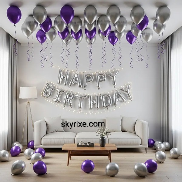 This décor transforms any living room into a celebratory lounge with a floating balloon canopy overhead and a glowing birthday focal wall. The metallic silver shine balanced with deep amethyst tones creates a sophisticated party atmosphere—ideal for surprise reveals, cake cutting, and cozy photo ...