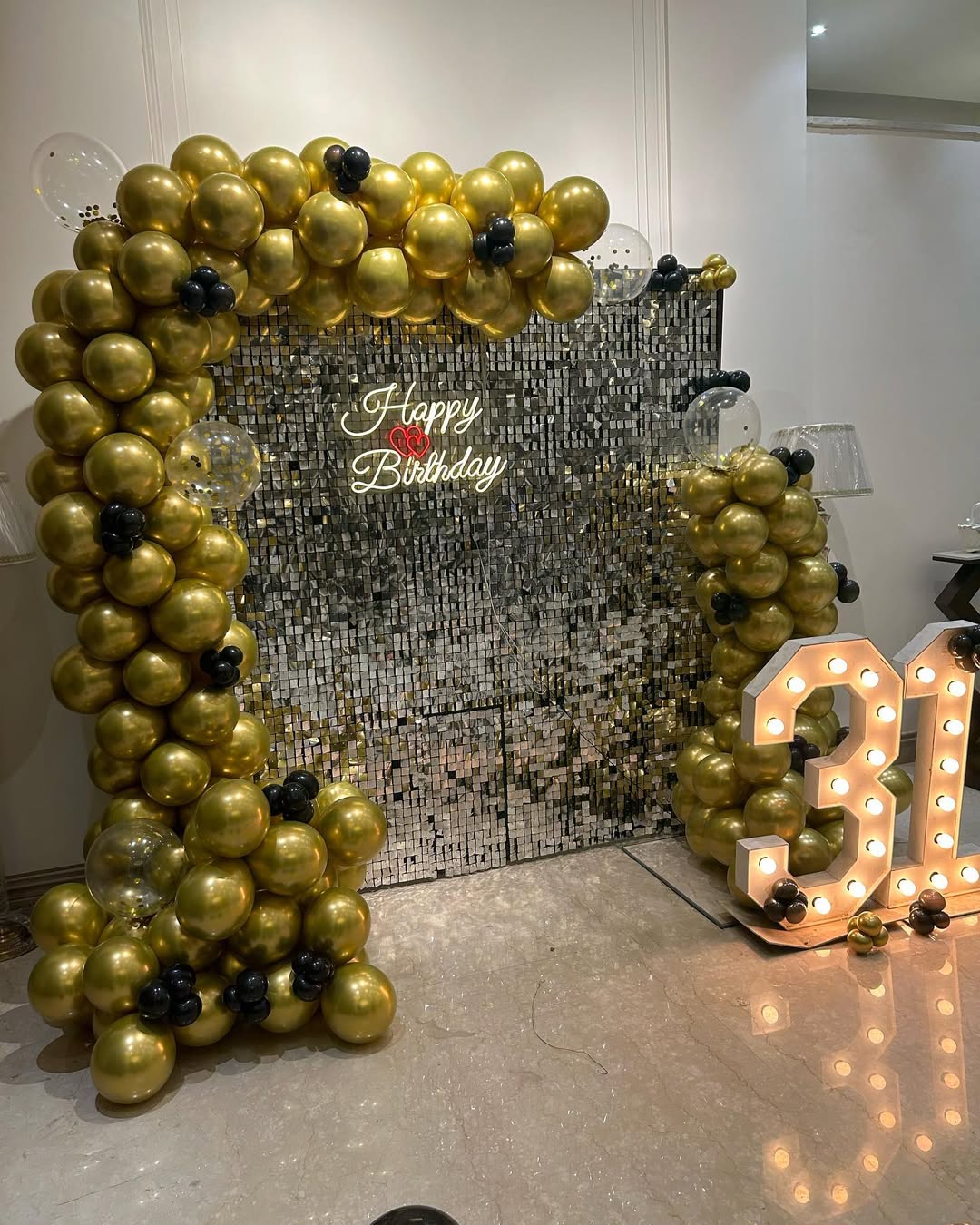 *️⃣ A sophisticated and elegant birthday setup featuring a golden balloon arch with black and transparent confetti balloons against a shimmer sequin backdrop. A "Happy Birthday" neon sign adds a *️⃣modern touch, while illuminated marquee numbers "31" make it ideal for milestone celebrations....