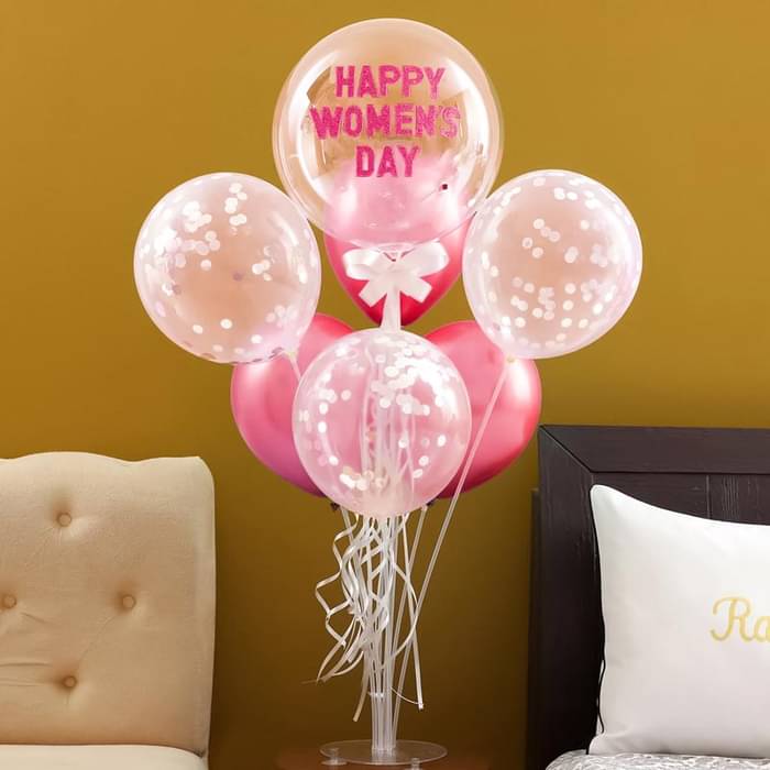 A chic and elegant balloon arrangement in shades of pink and white, designed to celebrate Women's Day in style. The transparent bubble balloon with "HAPPY WOMEN’S DAY" text, along with confetti-filled balloons, creates a sophisticated and festive ambiance.