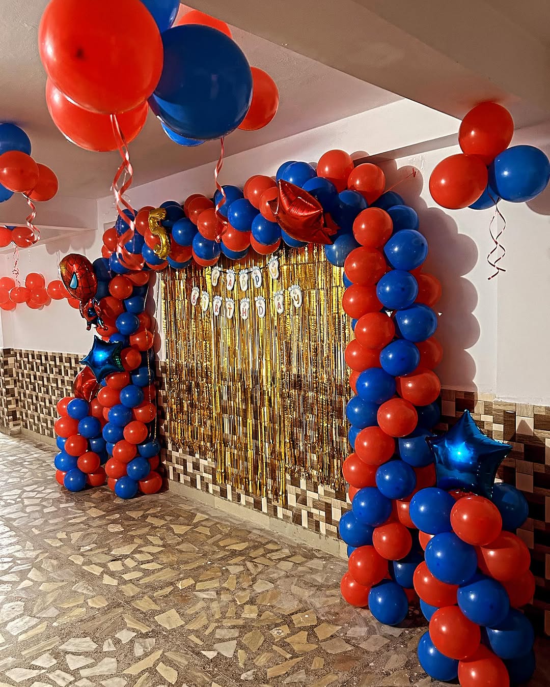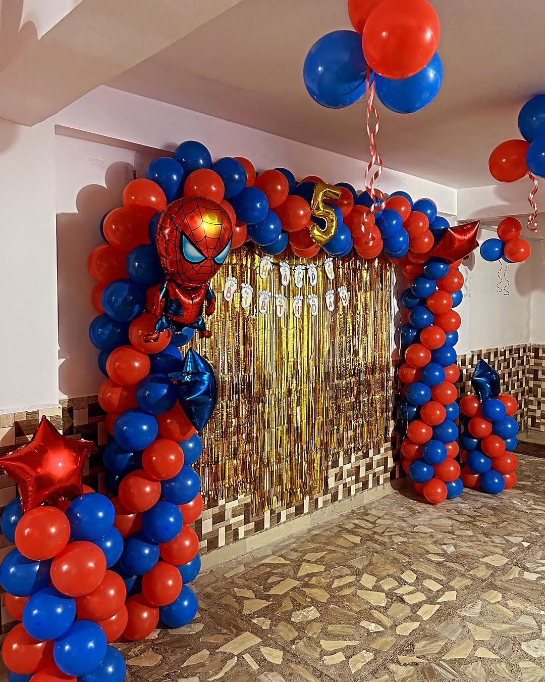 A superhero-themed balloon decoration, featuring a red and blue balloon arch with Spider-Man elements. This design includes twisted balloon pillars, a gold tinsel backdrop, foil balloons, and a Spider-Man-shaped balloon. The floating balloons on the ceiling enhance the theme, making it perf...