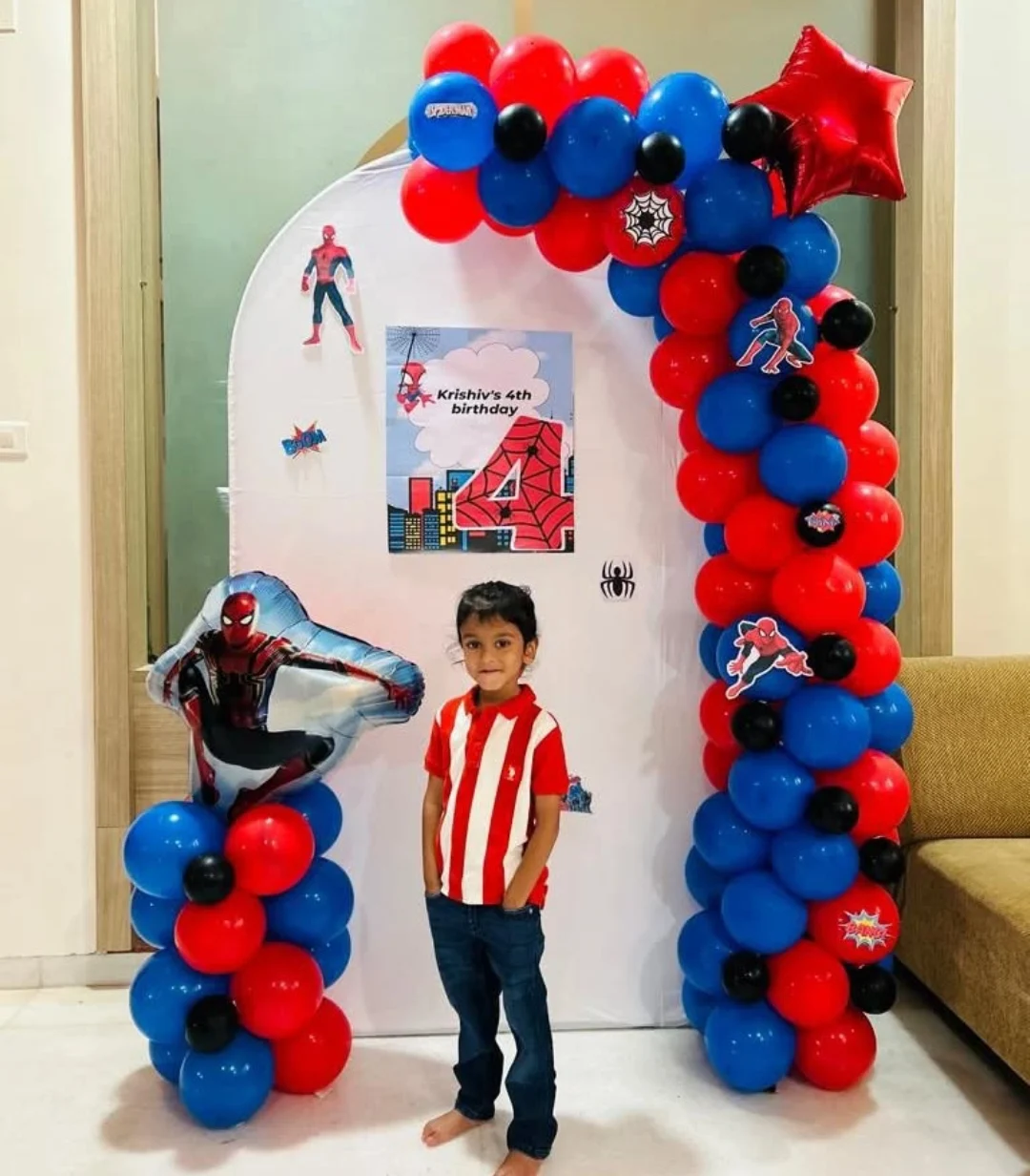 This Spider-Man-themed birthday setup is perfect for little superhero fans! The decoration features a bold red and blue balloon arch, Spider-Man-themed stickers, cutouts, and foil balloons, along with a customized birthday backdrop. The design is inspired by comic book elements and cityscape them...
