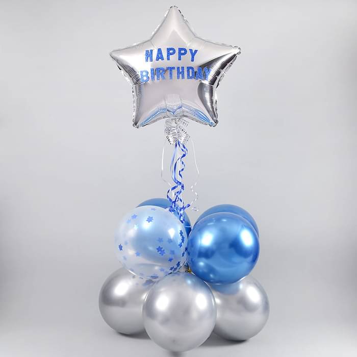 A sleek and stylish balloon arrangement featuring a silver and blue color theme, designed for birthday celebrations. The star-shaped foil balloon with "HAPPY BIRTHDAY" text adds a festive and elegant touch.