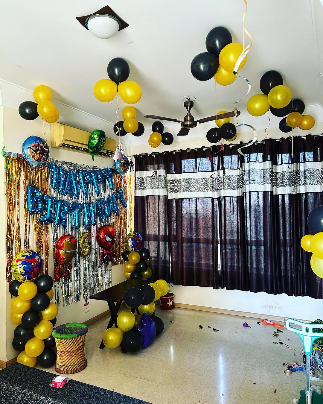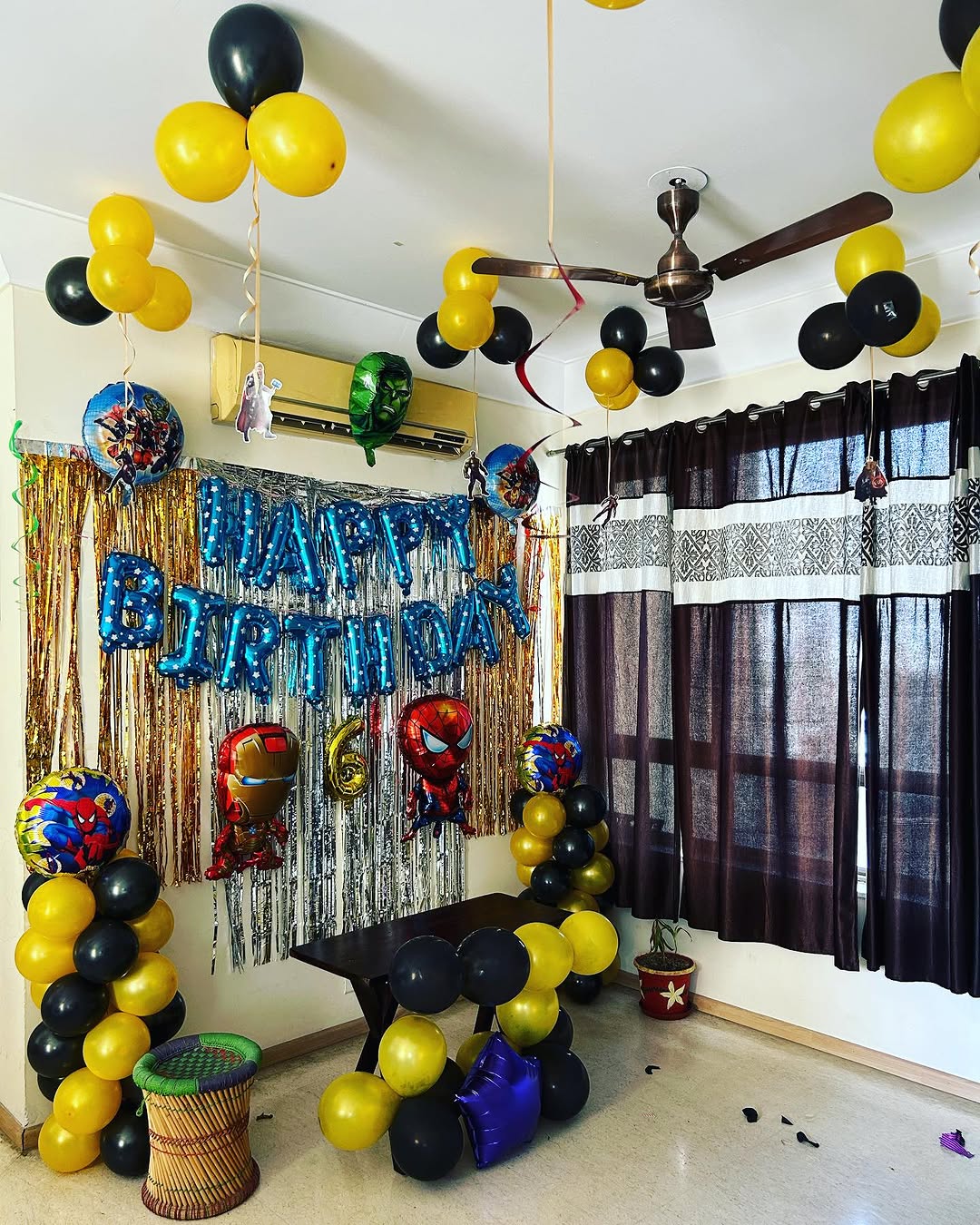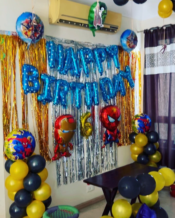 This Superhero-themed birthday setup is designed for a fun-filled celebration with favorite Marvel characters like Spider-Man, Iron Man, and Hulk. The backdrop features a metallic silver and gold fringe curtain, creating a vibrant and eye-catching background. Large blue "HAPPY BIRTHDAY" letter ba...