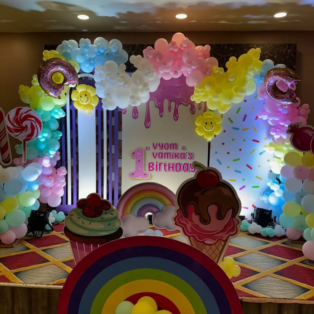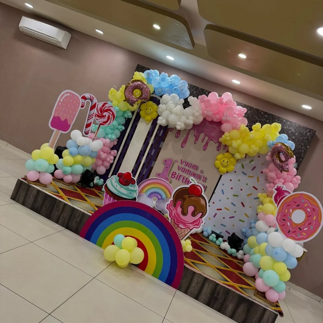 This playful and vibrant birthday stage setup is designed with a candy and dessert theme, making it perfect for a child's birthday celebration. The decoration includes pastel-colored balloon garlands, oversized candy props (lollipops, donuts, ice cream cones), smiley face balloons, and a rainbow ...
