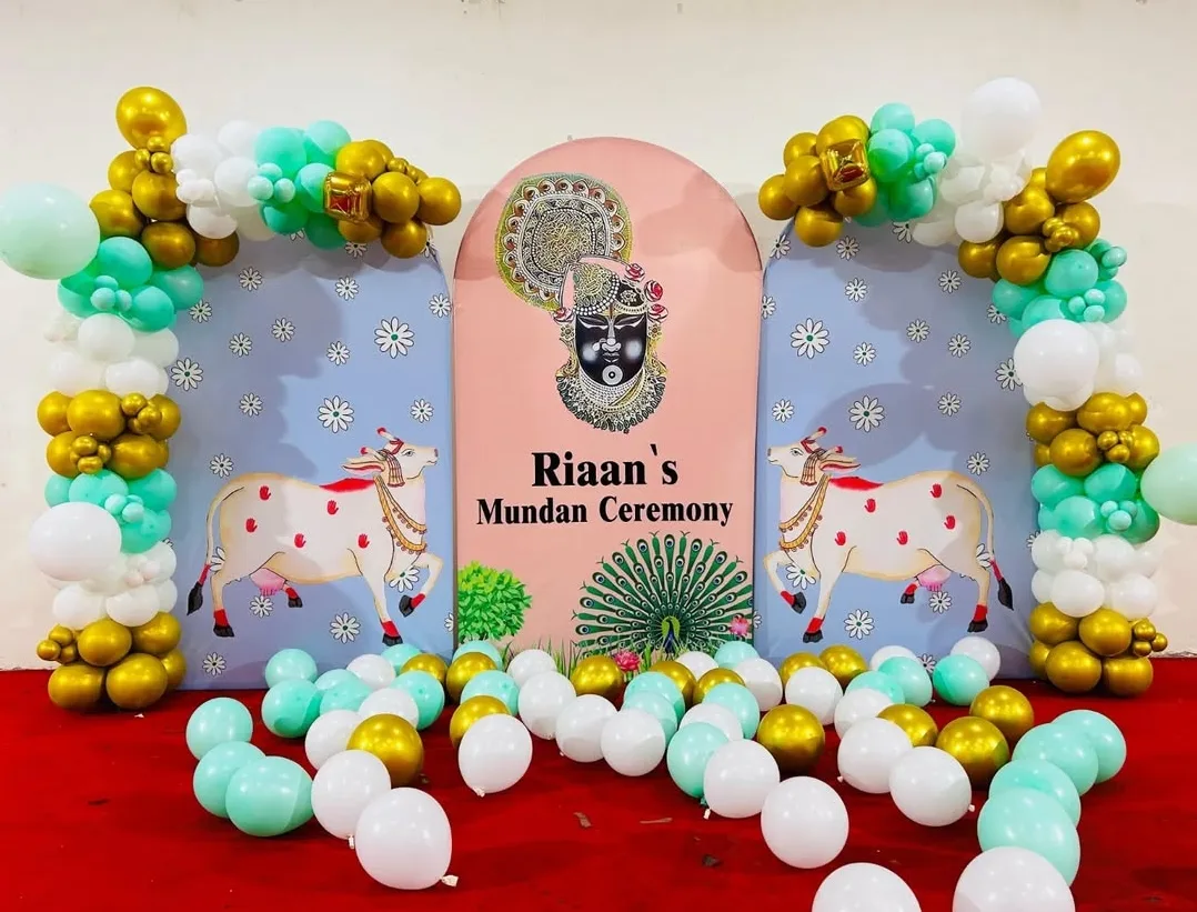 This divine and cultural backdrop is designed specifically for a Mundan (first haircut) ceremony. The setup features a spiritual theme with a customized name board at the center, adorned with artwork of Lord Krishna, sacred cows, and a peacock, symbolizing purity, blessings, and prosperity. The b...