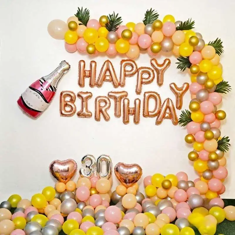 This vibrant and fun corner balloon décor is the perfect way to celebrate a birthday in style. With a mix of pastel pink, yellow, gold, and silver balloons accented with tropical artificial leaves, a champagne bottle foil, and a “Happy Birthday” message, this set...