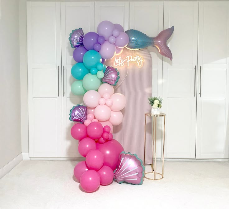A magical and vibrant mermaid-themed balloon backdrop perfect for birthdays and girls' celebrations. The setup includes pastel-colored balloons, shiny shell foil balloons, a mermaid tail foil, and a stylish backdrop with a "Let's Party" neon sign. This decor brings a dreamy undersea vibe ideal fo...