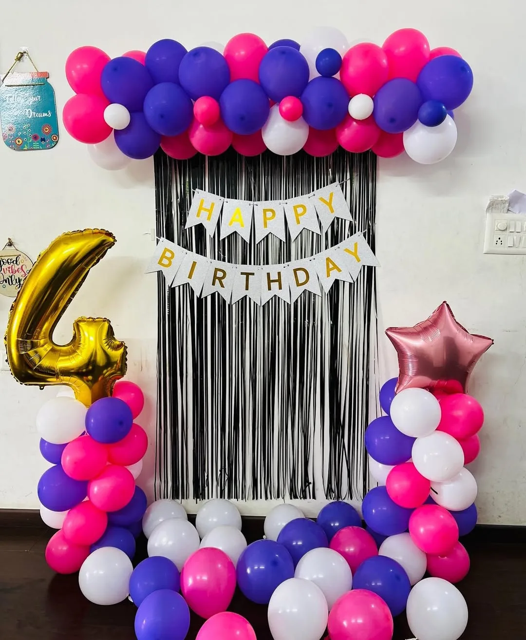 This fun and stylish birthday backdrop is perfect for celebrating a 4th birthday (or any other age with customization). The pink, purple, and white balloon arrangement creates a lively and playful atmosphere, complemented by the black fringe curtain backdrop that adds depth and elegance. The gold...