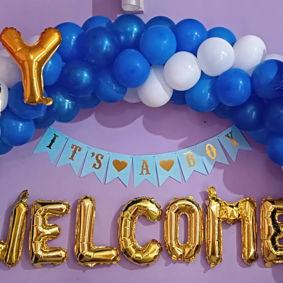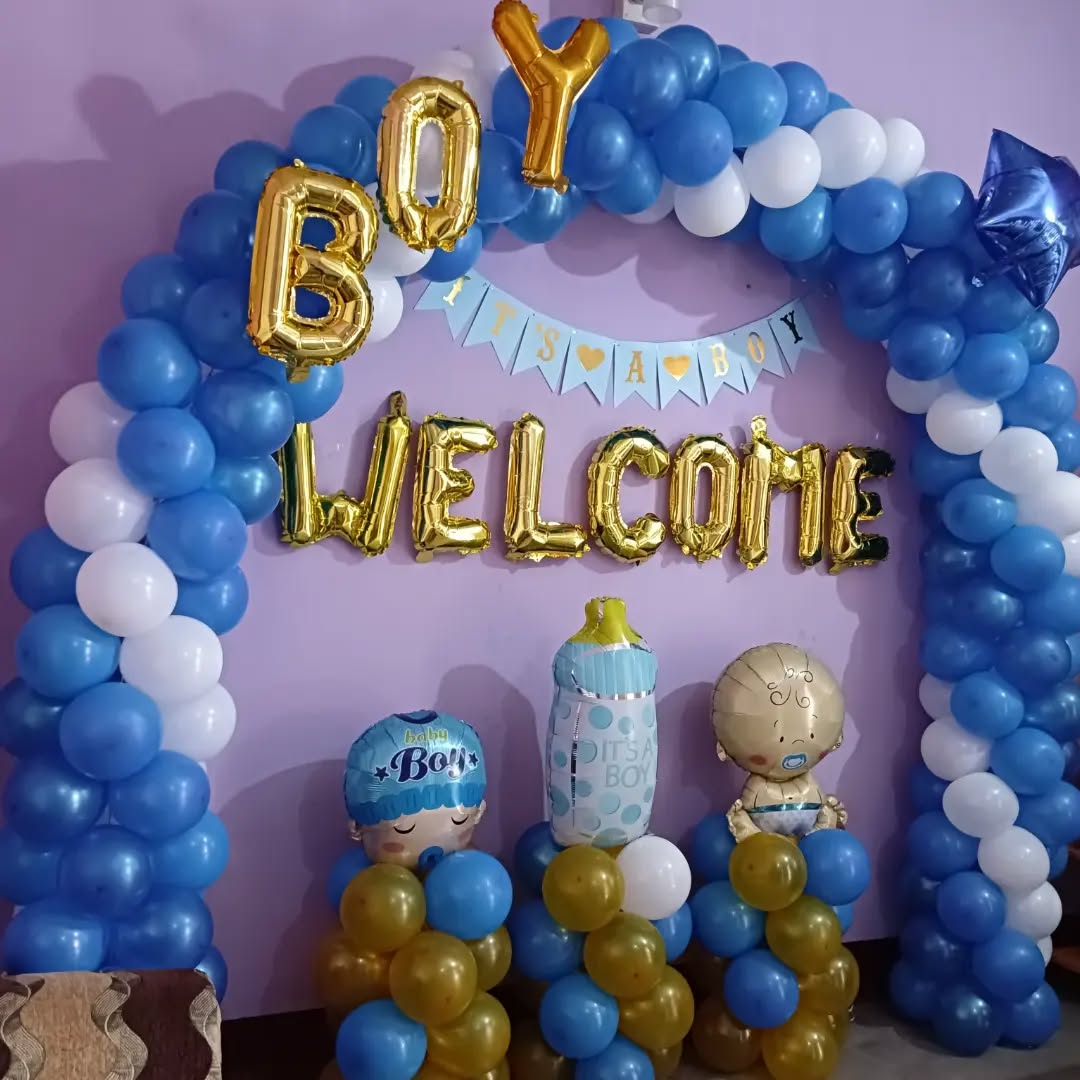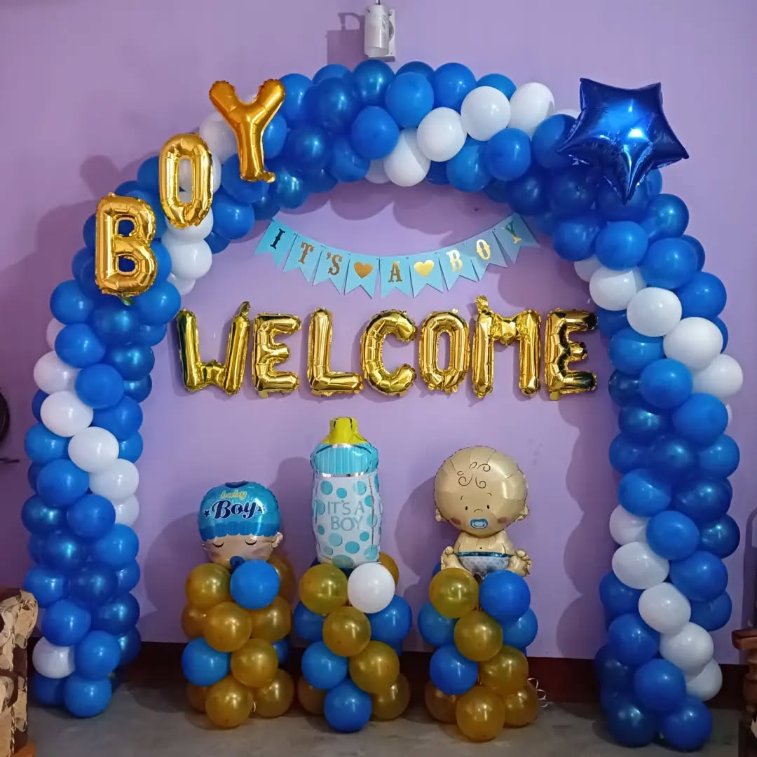 The Welcome Baby Boy Balloon Decor is a vibrant and cheerful setup ideal for celebrating the arrival of a newborn baby boy. Featuring a color palette of blue, white, and gold, this design brings a festive and elegant ambiance. The balloon arch creates a perfect photo backdrop, while the golden le...