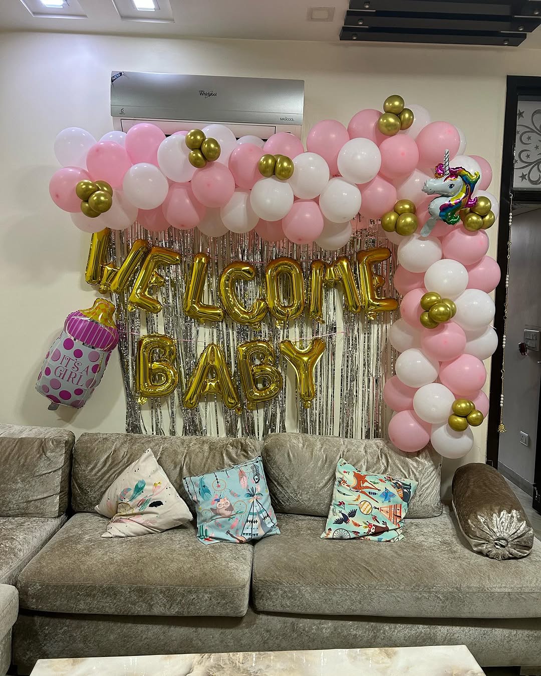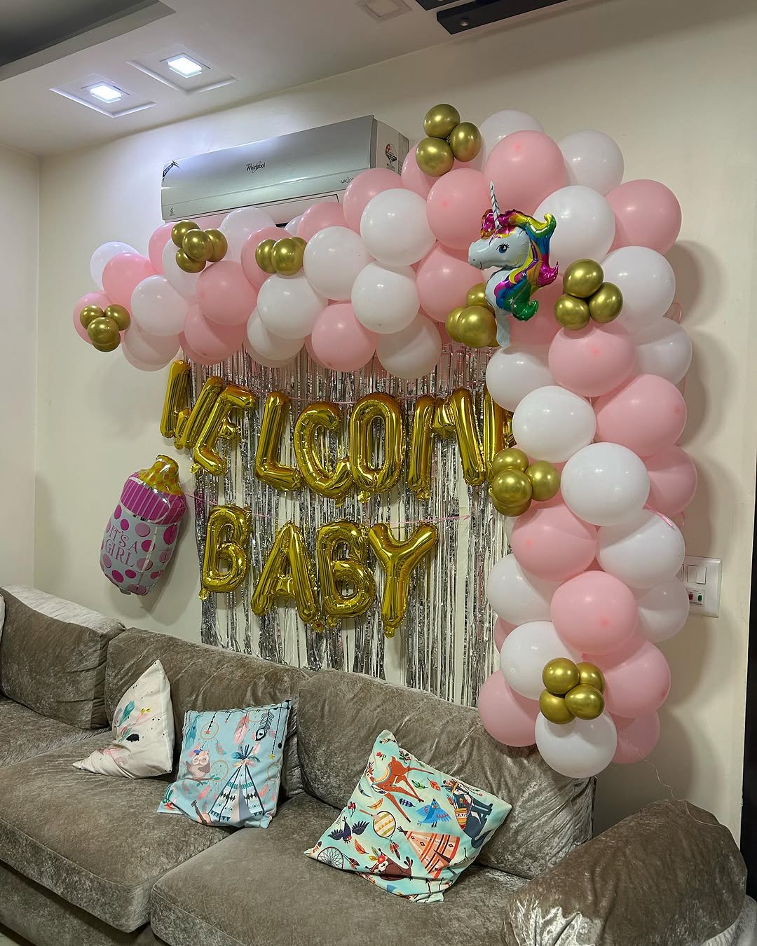 This "Welcome Baby" theme decoration is perfect for celebrating the arrival of a newborn girl. The combination of pink, white, and gold balloons creates a soft and joyful atmosphere, ideal for home celebrations, baby showers, or hospital room decorations.