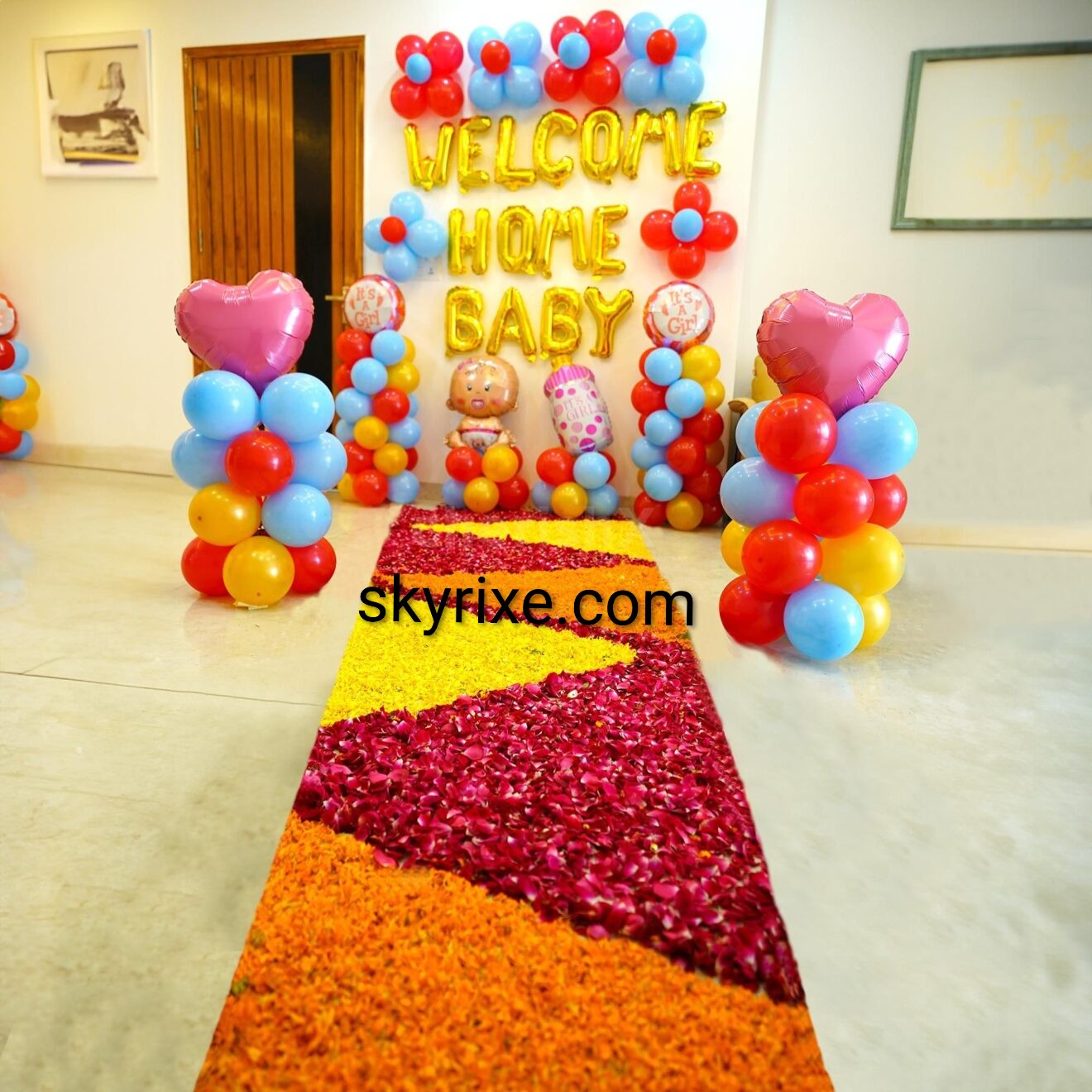 This decoration creates a heartwarming grand entry for welcoming your newborn home. The colorful setup, themed props, and floral pathway together provide a perfect celebration vibe and beautiful photo memories for the family.
