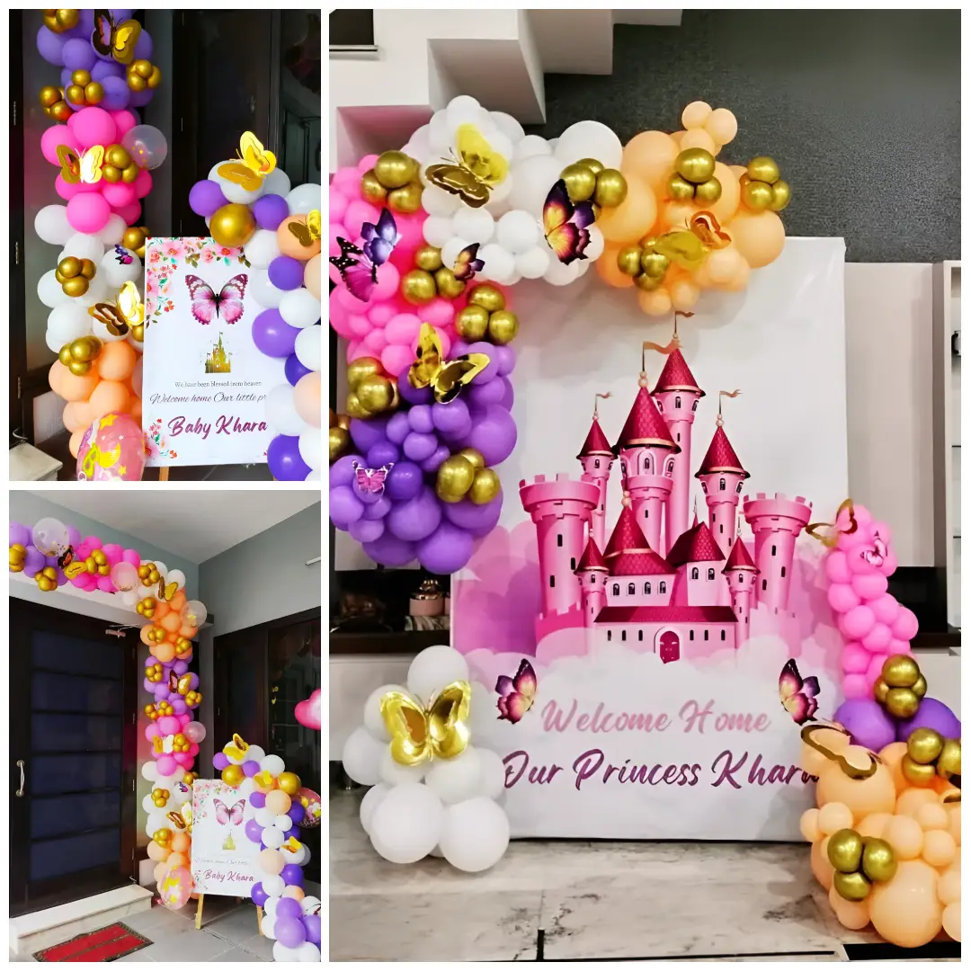 This setup is a royal princess-themed decoration perfect for welcoming a newborn baby girl. It includes a castle backdrop, pastel balloon garlands, golden balloons, and butterfly cutouts. The color theme of pink, purple, peach, gold, and white gives it a soft yet royal vibe. This design is best f...